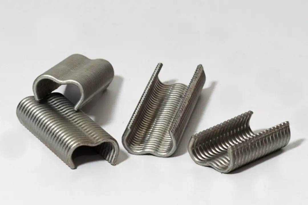 Tvirtinimo skobos tinklo tvirtinimui prie įtempimo vielos.